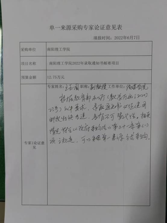 为做好我校录取通知书邮寄工作,将录取通知书快速、安全寄送到考生手中,根据教育部办公厅《教育部办公厅国家邮政局办公室关于进一步做好2020年高校录取通知书寄递工作的通知》(教学厅函〔2020〕23号)文件中“录取通知书必须使用邮寄特快专递等给据邮寄方式寄递”的要求,我校拟采用中国邮政特快专递方式寄送录取通知书。中国邮政速递物流股份有限公司南阳市分公司,以邮政、快递物流等为主业,具有不可替代性。
