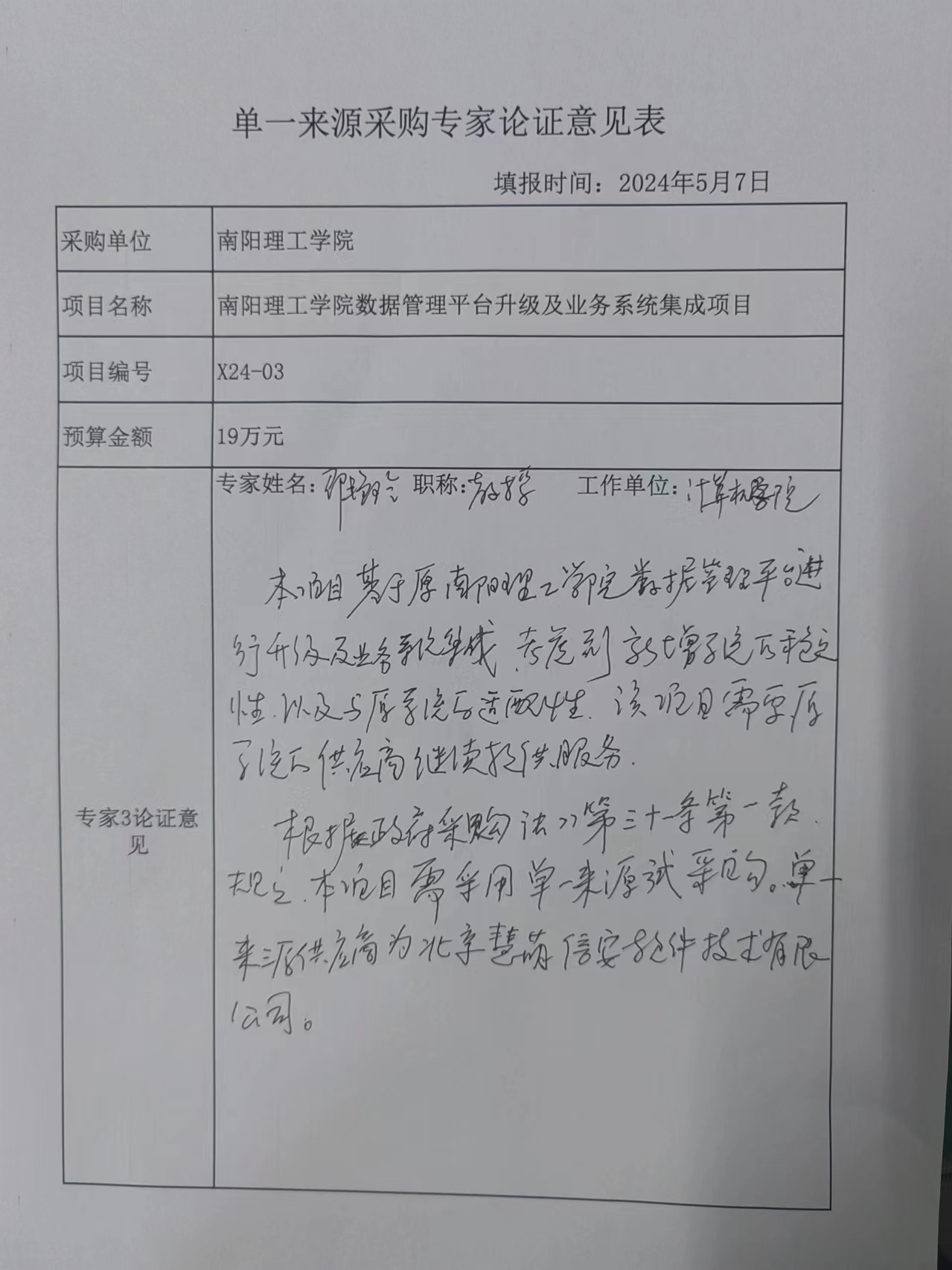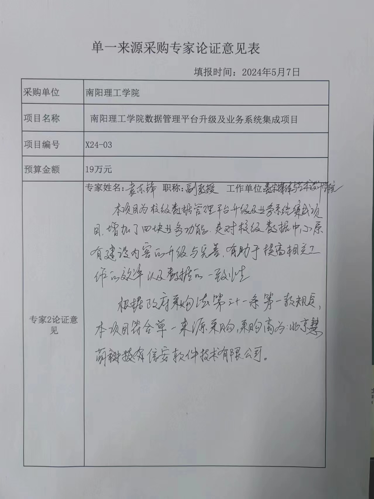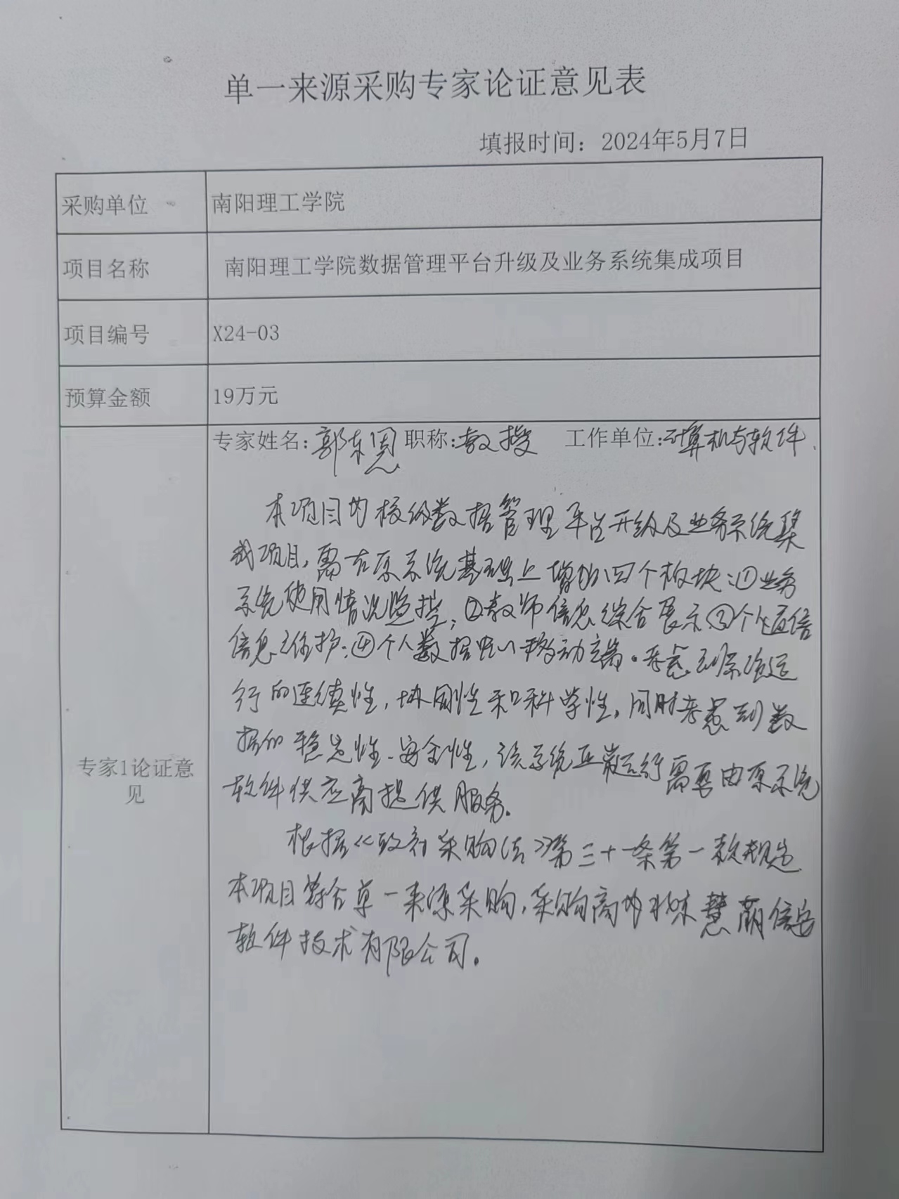 南阳理工学院数据管理平台升级及业务系统集成项目拟采用单一来源采购的论证公示